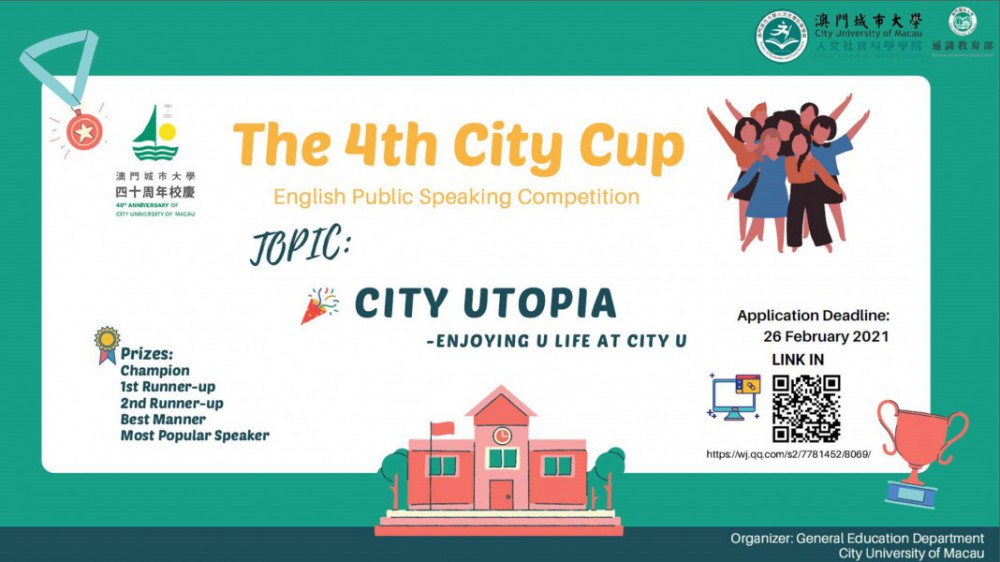 The 4th City Cup English Public Speaking Competition is going to be held in the second semester, and the contest this year will be part of the series of events celebrating the 40th anniversary of our beloved school! The General Education Department (GED) of City University of Macau looks forward to seeing all the talented speakers in our school joining this year’s big event!