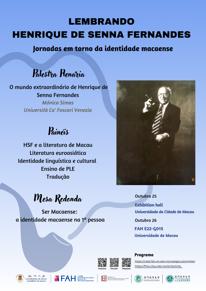A secção portuguesa da Faculdade de Humanidades e Ciências Sociais da Universidade Cidade de Macau e o Centro de Investigação para Estudos Luso-Asiáticos (CIELA)/Departamento de Português da Universidade de Macau organizam conjuntamente a conferência “Lembrando Henrique de Senna Fernandes: Jornadas em torno da identidade macaense”.