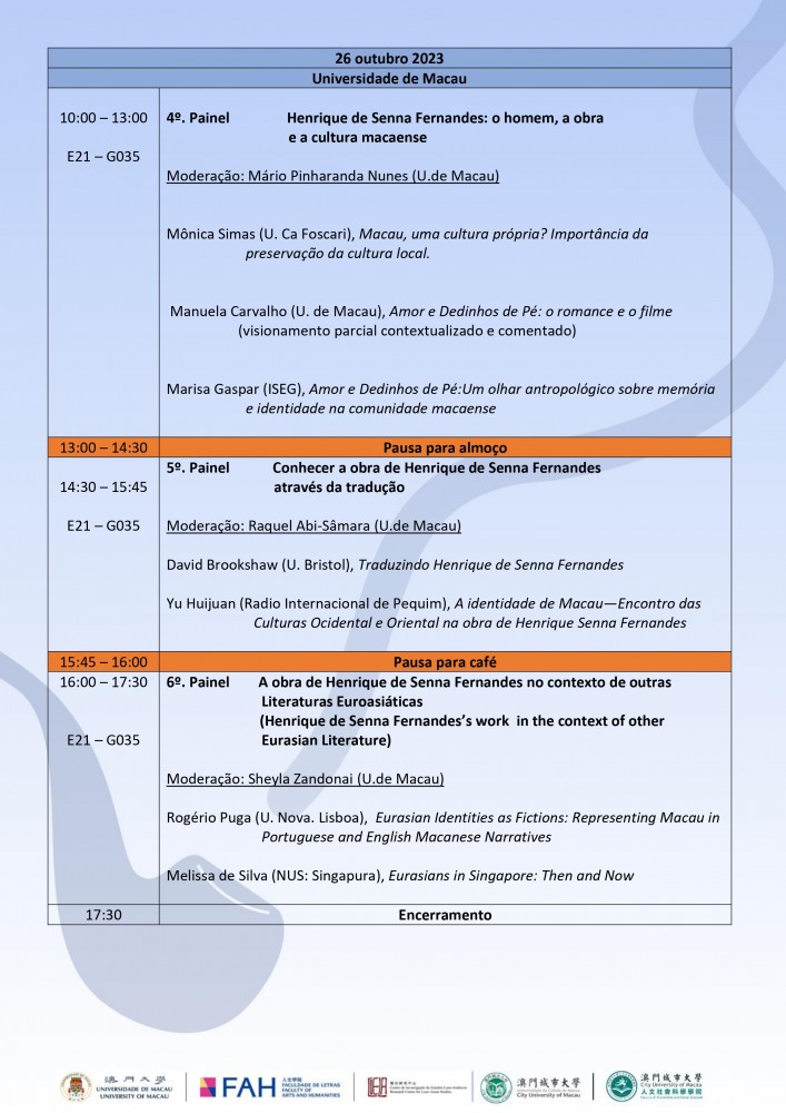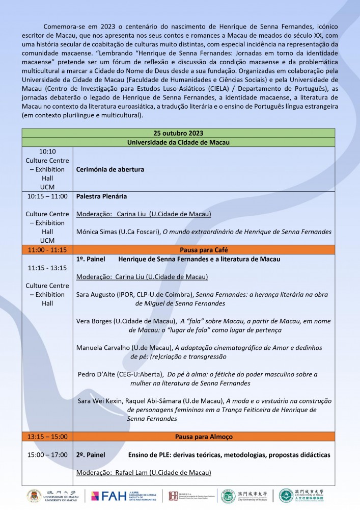 A conferência constará de duas palestras e 5 painéis onde serão debatidos o legado de Henrique de Senna Fernandes, a identidade macaense, a literatura de Macau no contexto da literatura euroasiática, a tradução literária, identidade linguística e cultural, o ensino de Português língua estrangeira (em contexto plurilingue e multicultural). Haverá ainda uma mesa-redonda sobre “A identidade macaense na primeira pessoa” e o visionamento comentado de “Amor e Dedinhos de Pé”.