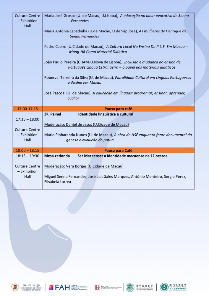 No dia 25 de outubro as jornadas decorrerão na Universidade Cidade de Macau (Culture Centre – Exhibition Hall) e no dia 26 na Universidade de Macau (FAH E22-G015).